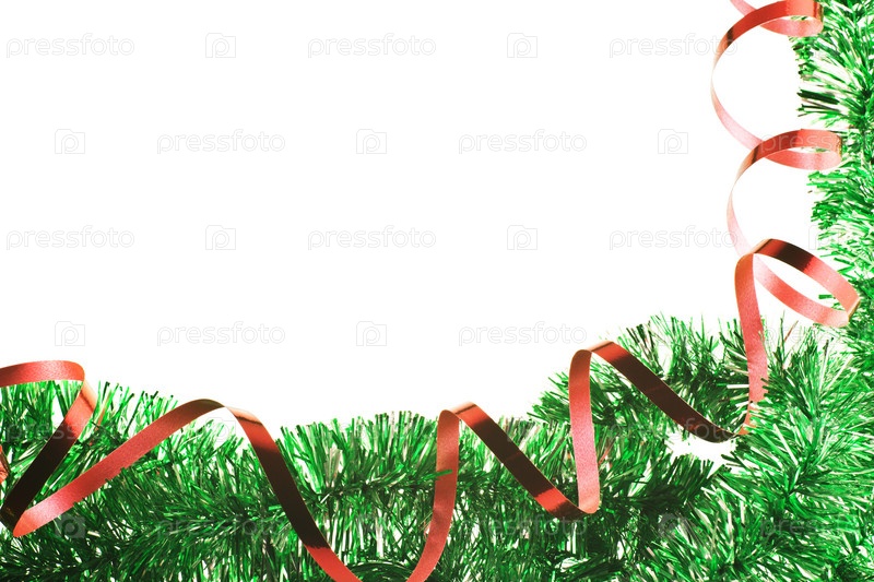Новогодняя рамка с зеленой мишурой и красной лентой