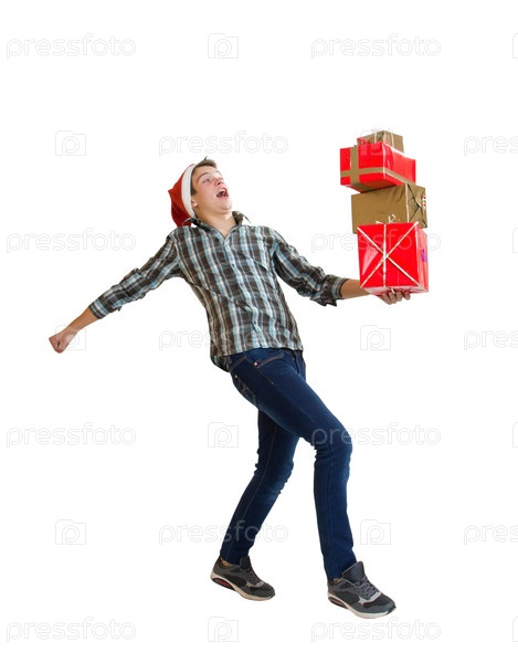 Подросток в новогодней шапке с подарком