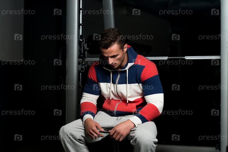 Молодой мускулистый мужчина отдыхает на скамейке