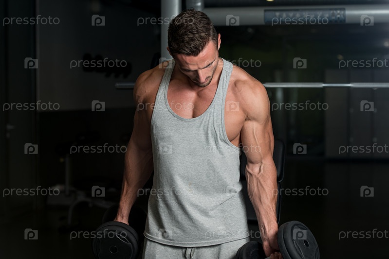 Мускулистый мужчина качает бицепсы в тренажерном зале
