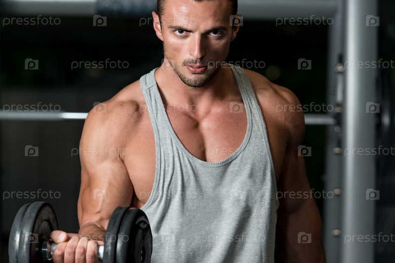 Мускулистый мужчина с гантелями в тренажерном зале
