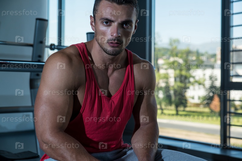 Мускулистый мужчина сидит на скамье в тренажерном зале