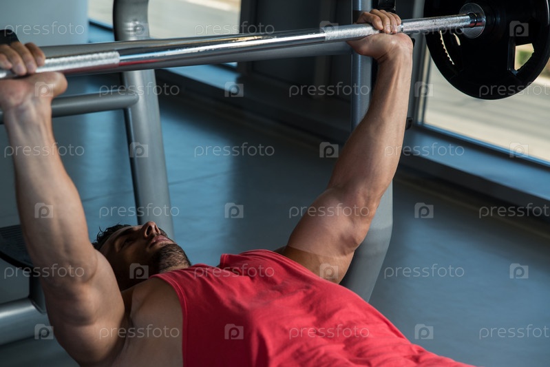 Мускулистый мужчина поднимает штангу в тренажерном зале