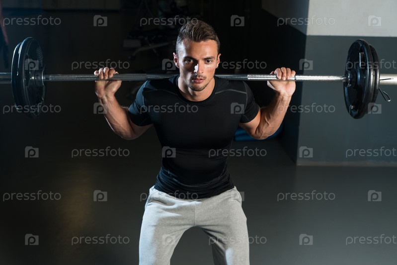 Мускулистый мужчина поднимает штангу в тренажерном зале