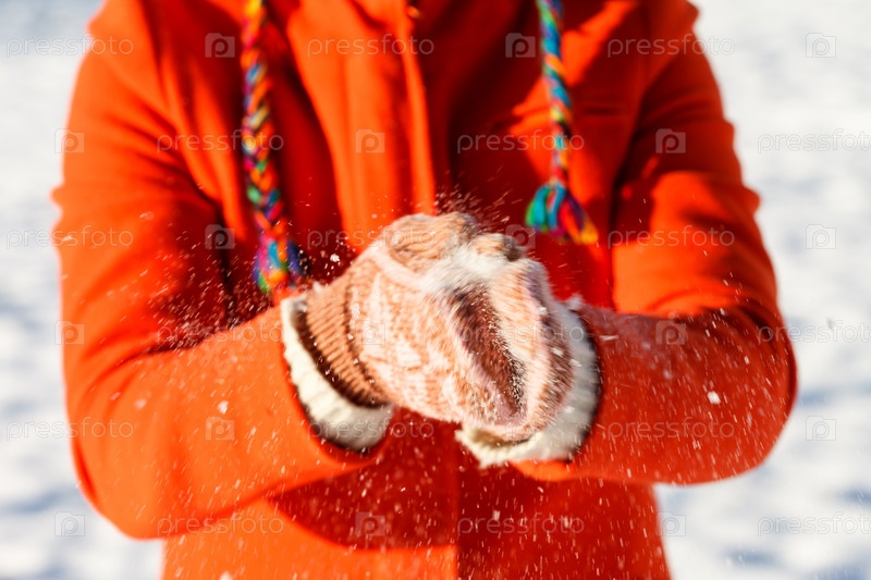 Женские руки в заснеженных варежках