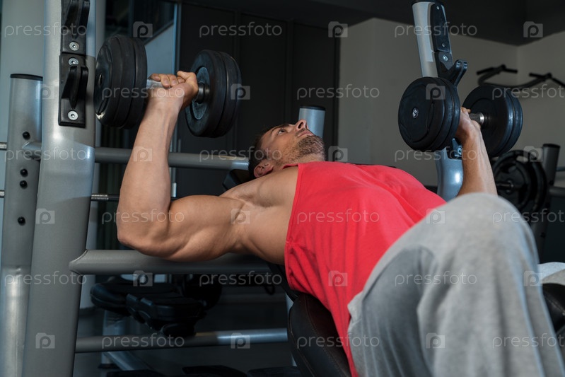 Культурист с гантелями на скамье