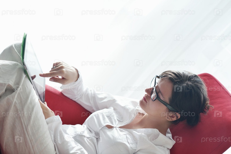 Женщина использует планшетный ПК дома