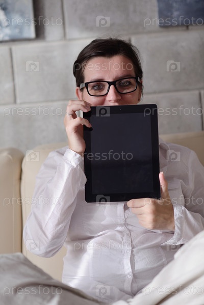 Женщина использует планшетный ПК дома
