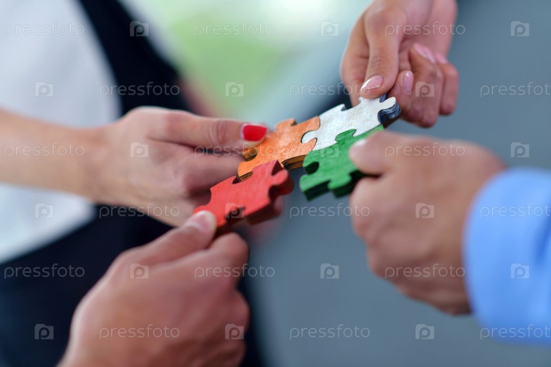 Группа деловых людей собирает головоломку