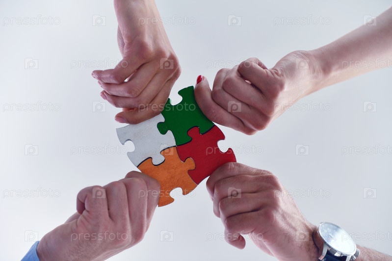 Группа деловых людей собирает головоломку