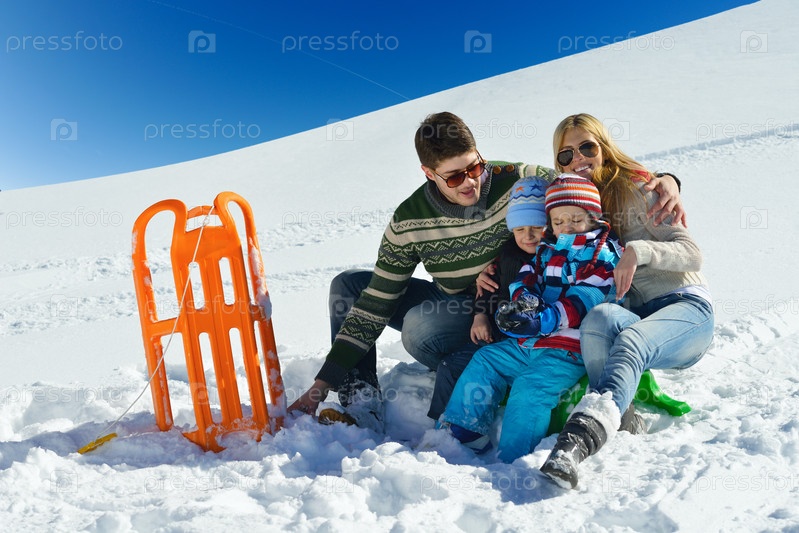 Семья играет в снегу на зимних каникулах
