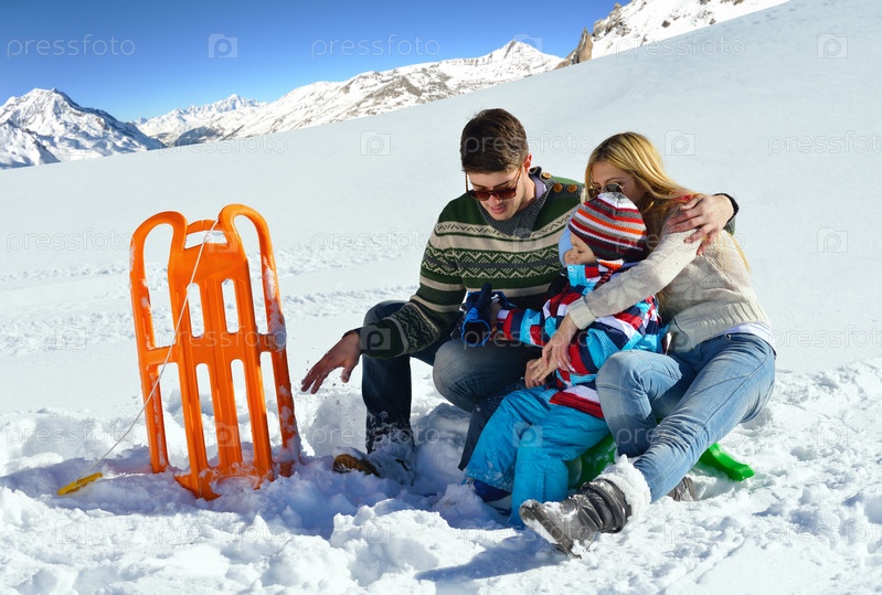 Семья играет в снегу на зимних каникулах