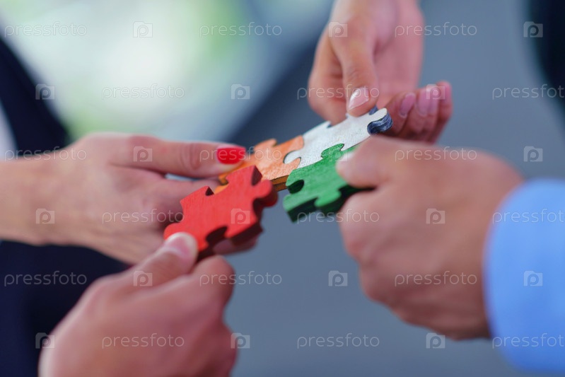 Группа деловых людей собирает головоломку