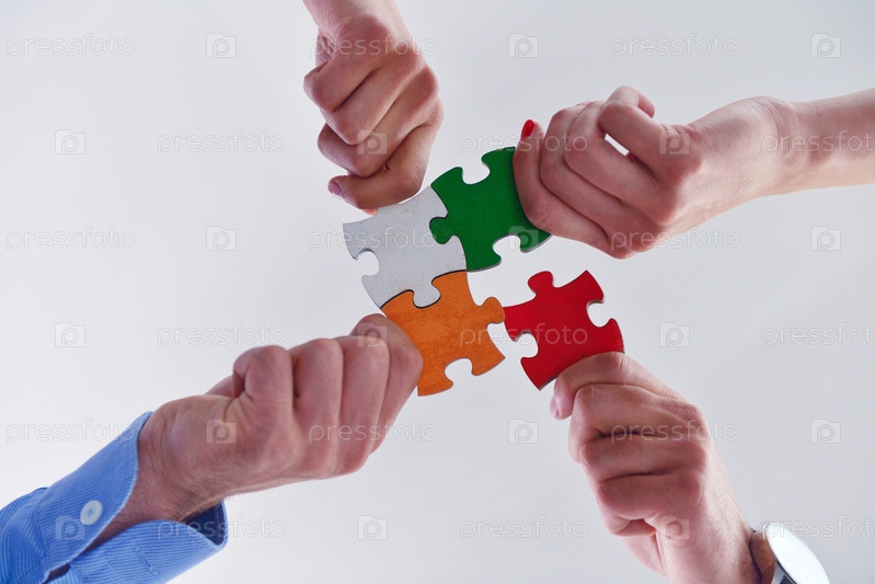Группа деловых людей собирает головоломку