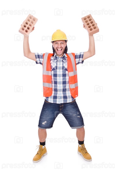 Строитель с глиняным кирпичом, изолированный на белом
