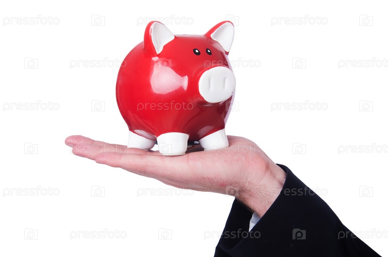 Человек с копилкой, изолированный на белом