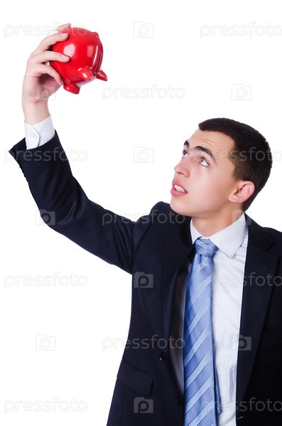 Человек с копилкой, изолированный на белом