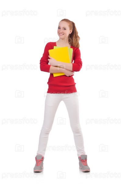 Молодой студент с книгами на белом фоне