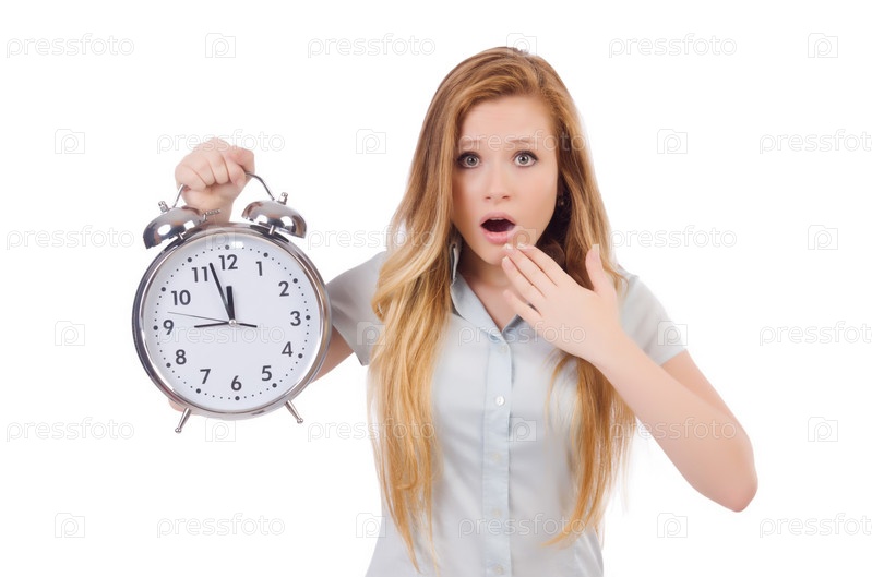Молодая женщина с часами на белом фоне