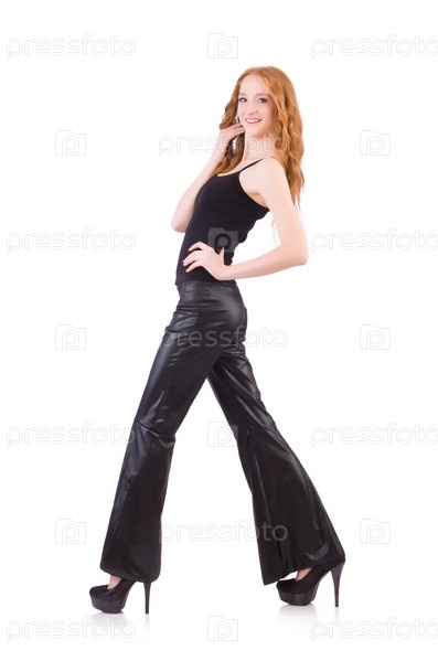 Рыжая женщина в черных расклешенных брюках на белом фоне