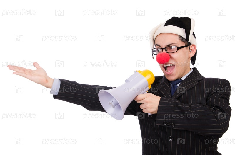 Бизнесмен клоун с громкоговорителем на белом фоне
