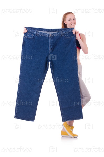 Женщина с большими джинсами в концепции диеты