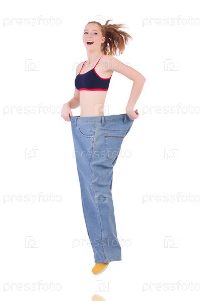 Женщина с большими джинсами в концепции диеты