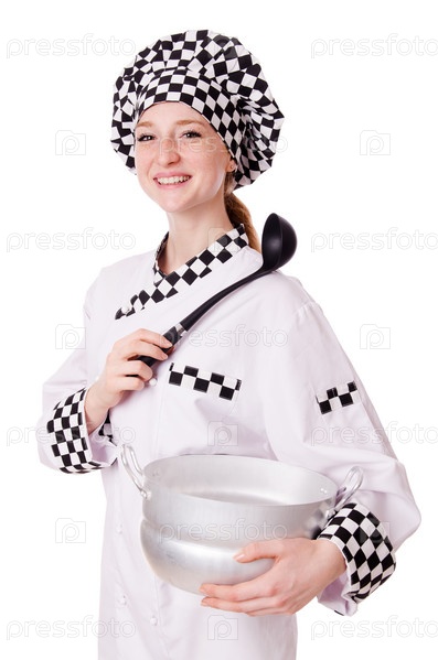 Молодая женщина повар, изолированная на белом