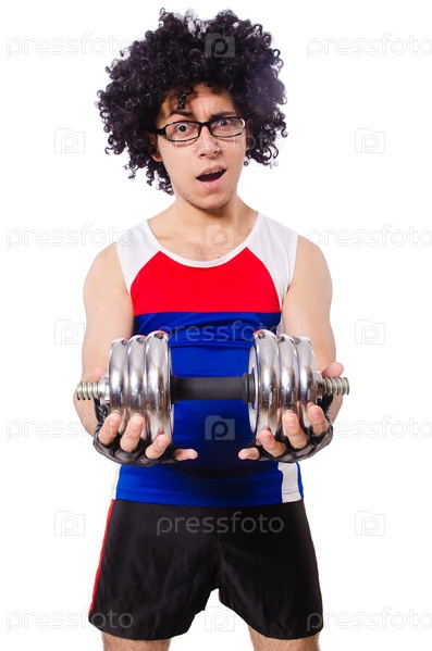Забавный мужчина с гантелями