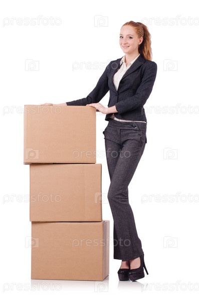 Деловая женщина с коробками на белом фоне