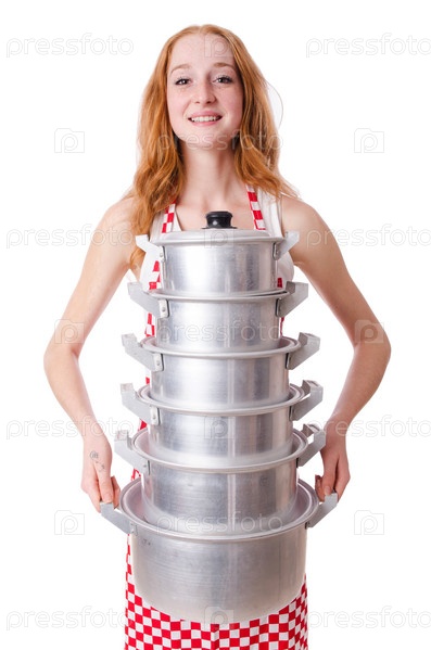 Молодая женщина повар, изолированная на белом