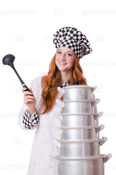 Молодая женщина повар, изолированная на белом