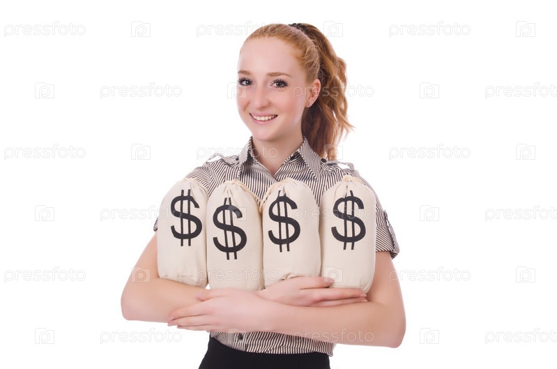Молодая бизнес-леди с мешками денег на белом фоне