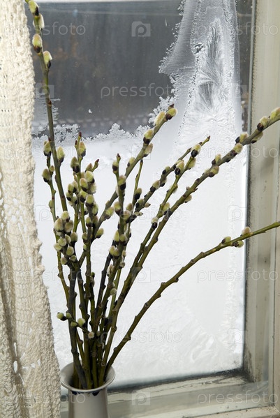 Веточки вербы в вазе на подоконнике