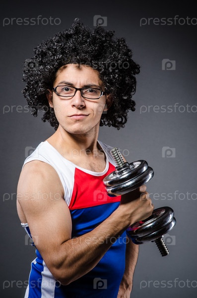 Забавный мужчина с гантелями