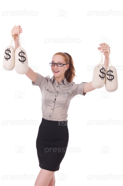Молодая бизнес-леди с мешками денег на белом фоне