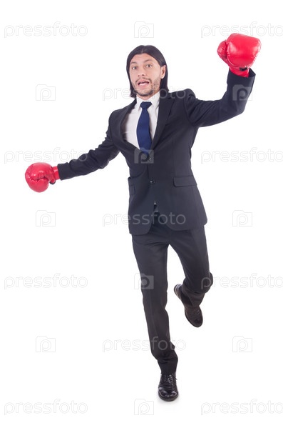 Бизнесмен с боксерские перчатками на белом фоне