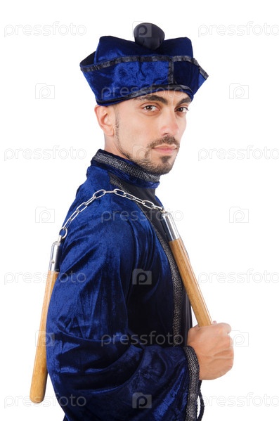 Мастер боевых искусств с нунчаками на белом фоне