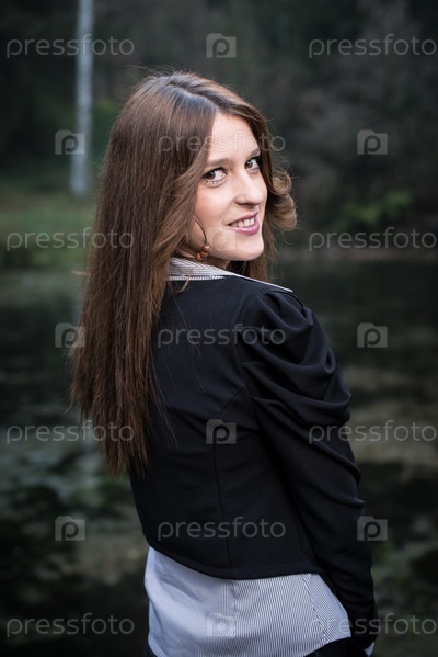 Молодая женщина в пиджаке смотрит через плечо