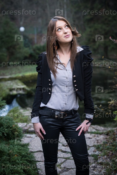 Молодая женщина в рубашке позирует на берегу озера