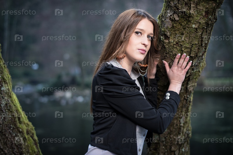 Молодая женщина позирует у дерева