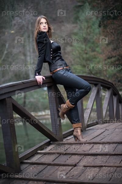 Молодая женщина стоит на мосту