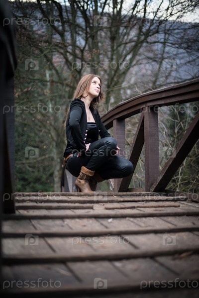 Молодая женщина сидит на корточках на мосту
