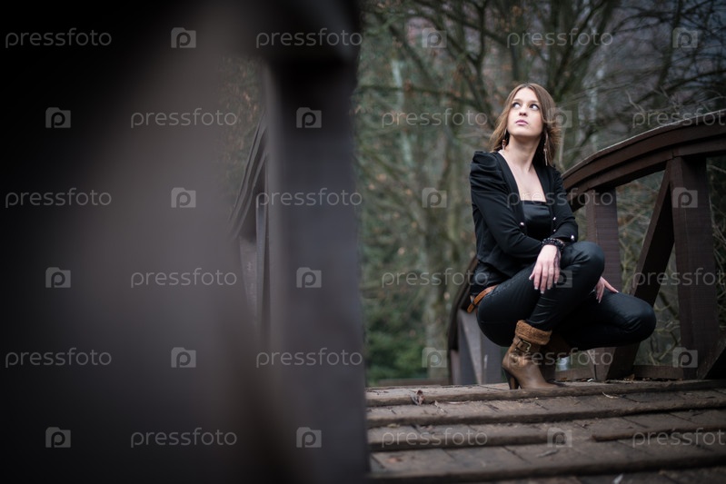 Молодая женщина сидит на корточках на мосту
