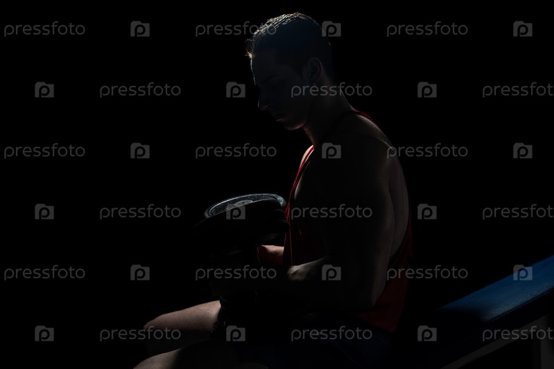 Молодой культурист отдыхает на скамейке на черном фоне