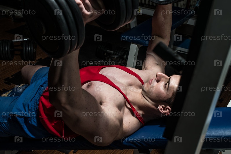 Молодой культурист делает жим лежа
