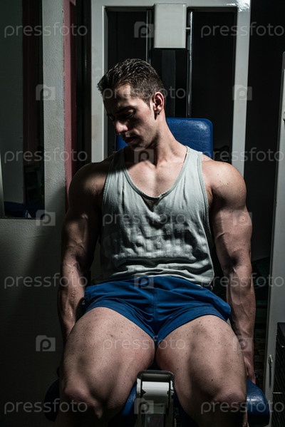 Молодой культурист отдыхает на скамейке