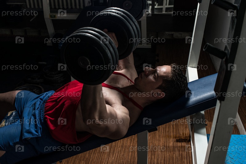 Молодой культурист делает жим лежа