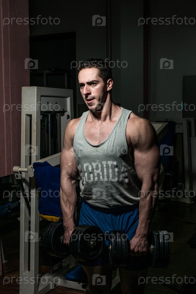 Културист делает упражнения для плеч с гантелями