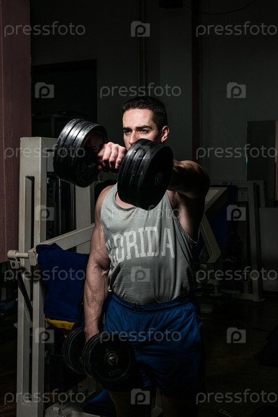 Културист делает упражнения для плеч с гантелями